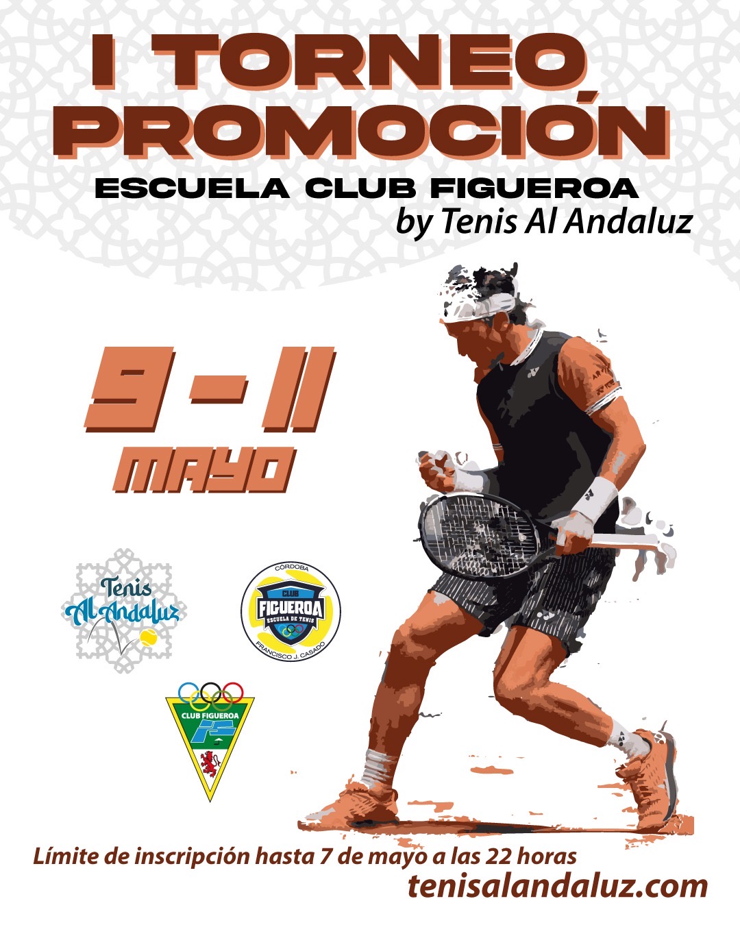 En este 2025, traemos un nuevo torneo, en esta ocasión, de promoción. Estaremos en el clásico Club Figueroa para la disputa del I Torneo Promoción Escuela Club Figueroa by Tenis Al-Andaluz. Será del 9 al 11 de mayo.La inscripción permanecerá abierta hasta el miércoles 7 de mayo a las 22 horas. I TORNEO PROMOCIÓN ESCUELA CLUB FIGUEROA9 AL 11 DE MAYO DE 2025CLUB FIGUEROAAvenida Mediterráneo s/n14011 Córdoba RELLENANDO EL FORMULARIO DE INSCRIPCIÓN ANTES DEL MIÉRCOLES 7 A LAS 22:00 HORASDebes enviar el comprobante bancario del ingreso de la inscripción. CAIXABANK ES77 2100 9799 4602 0028 4571 Categorías inferiores: 15€Absoluto y veteranos: 18€ BENJAMÍN – ALEVÍN – INFANTIL – CADETE – ABSOLUTO– VETERANOS +35 Límite de Inscripción: Miércoles 7 de mayo a las 22 horas.